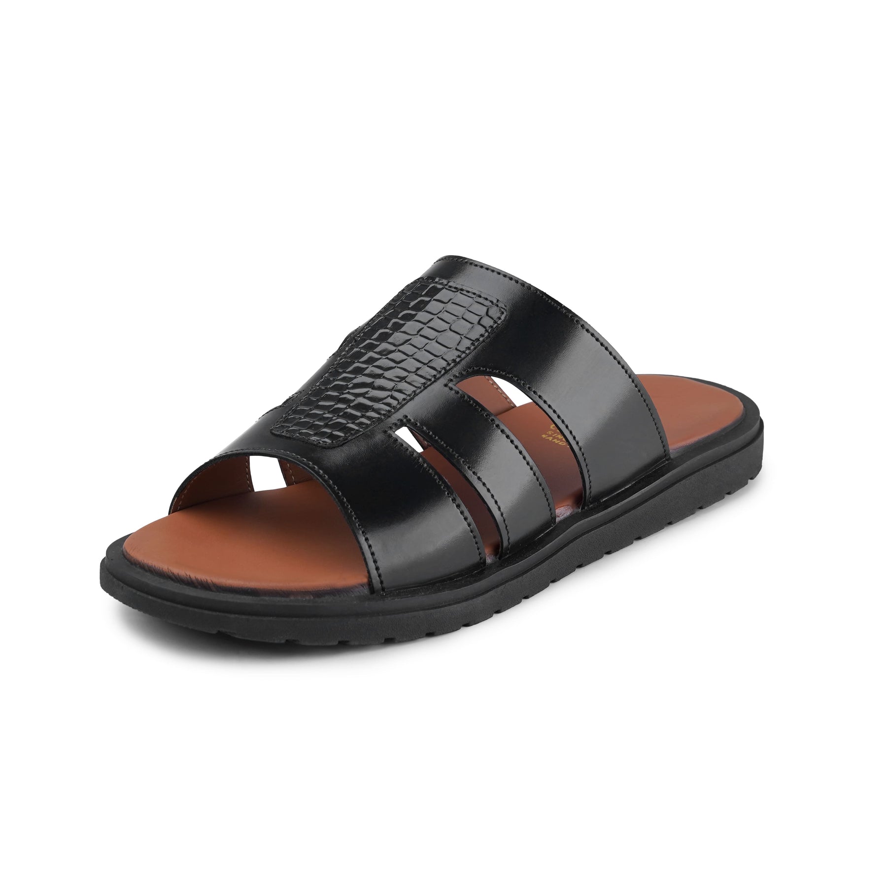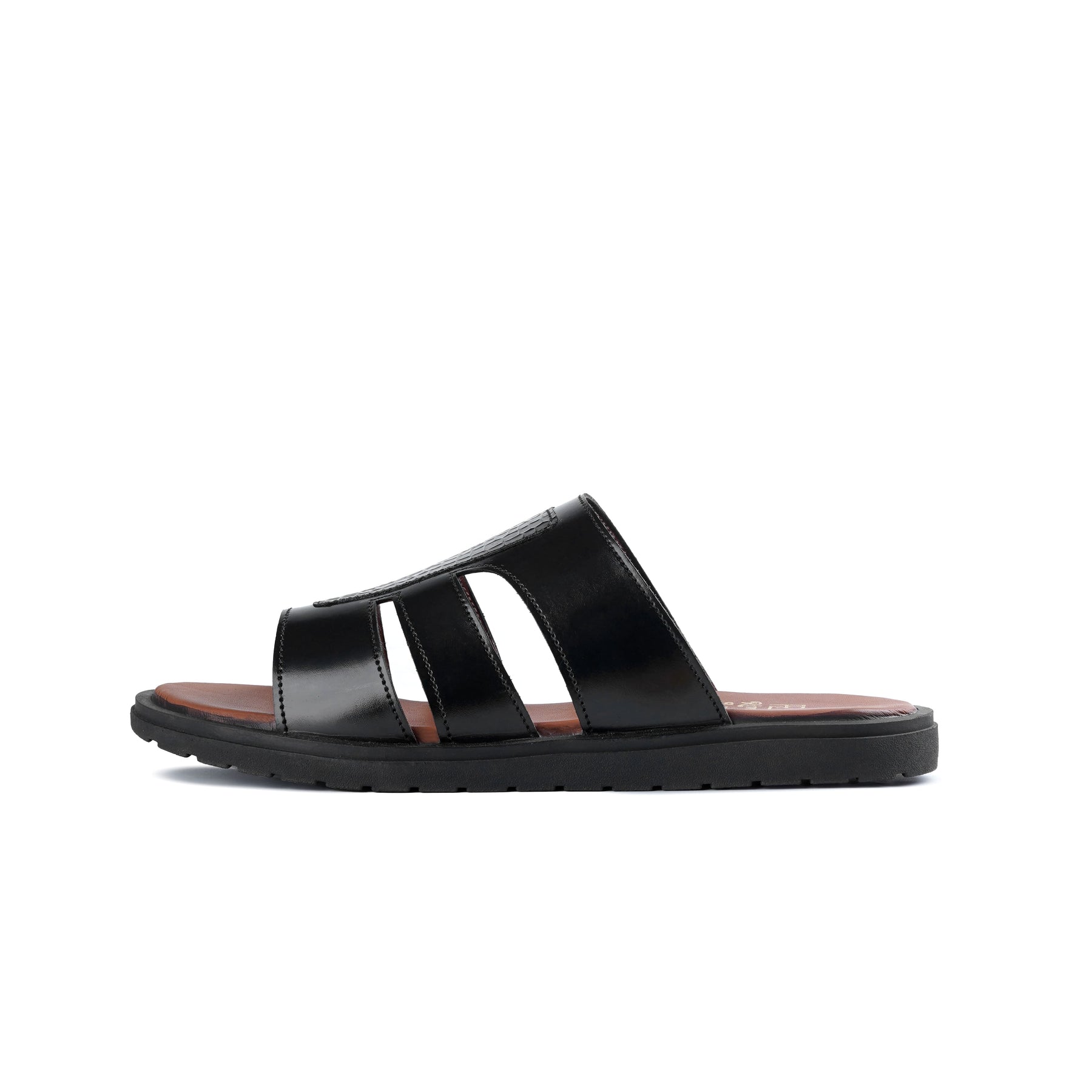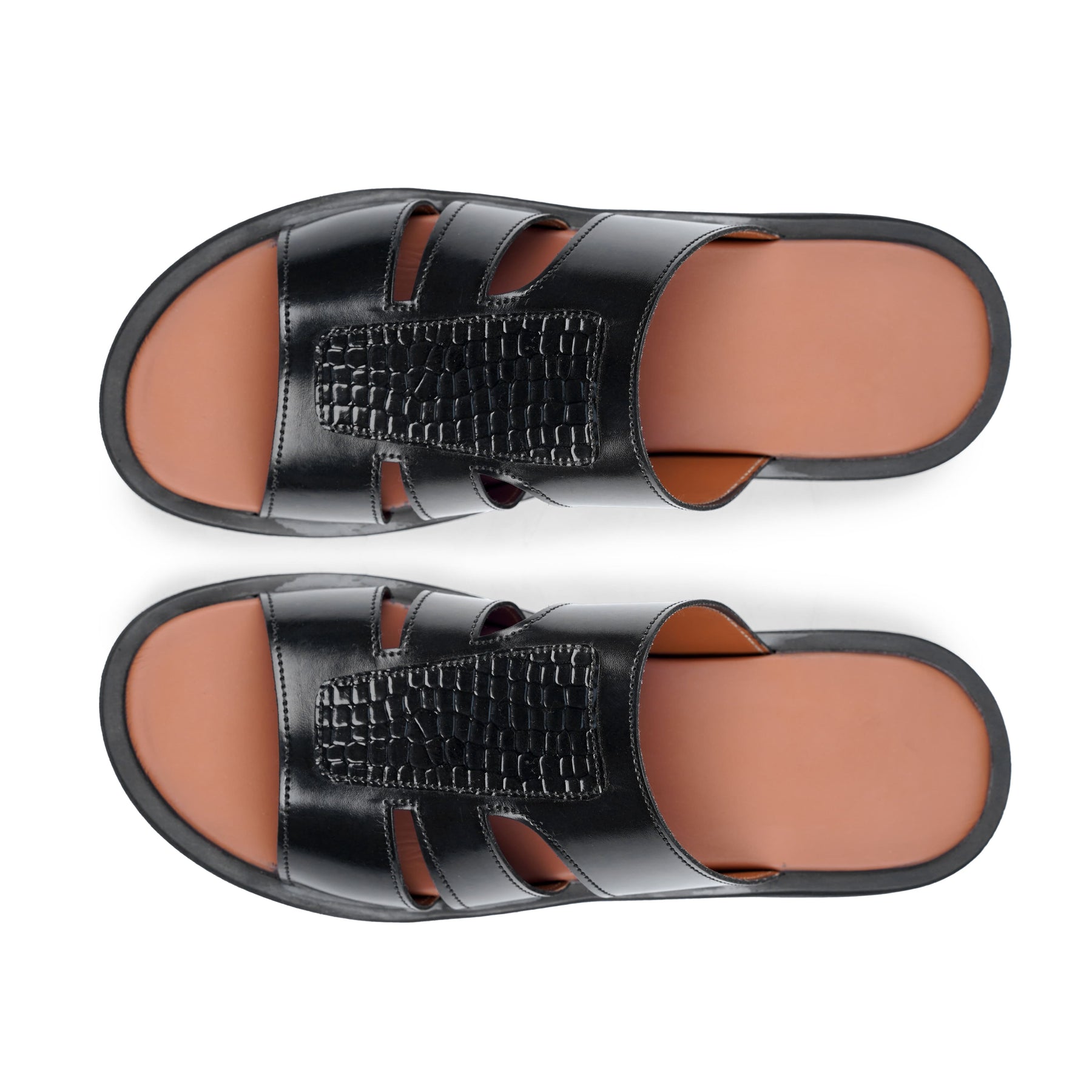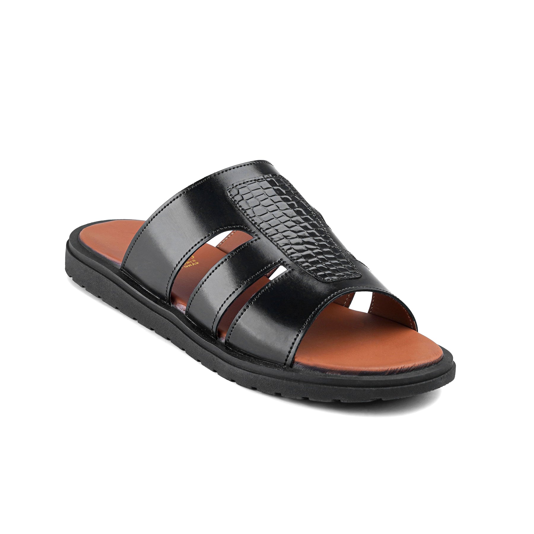 A smart, formalslip‑on slide sandaldesigned with agloss black upper,breathable cut‑out straps, and acroc‑textured front panelfor a premium look. Finished with acontrast tan footbedand adurable black outsole, making it a great match forshalwar kameezand everyday smart-casual wear.