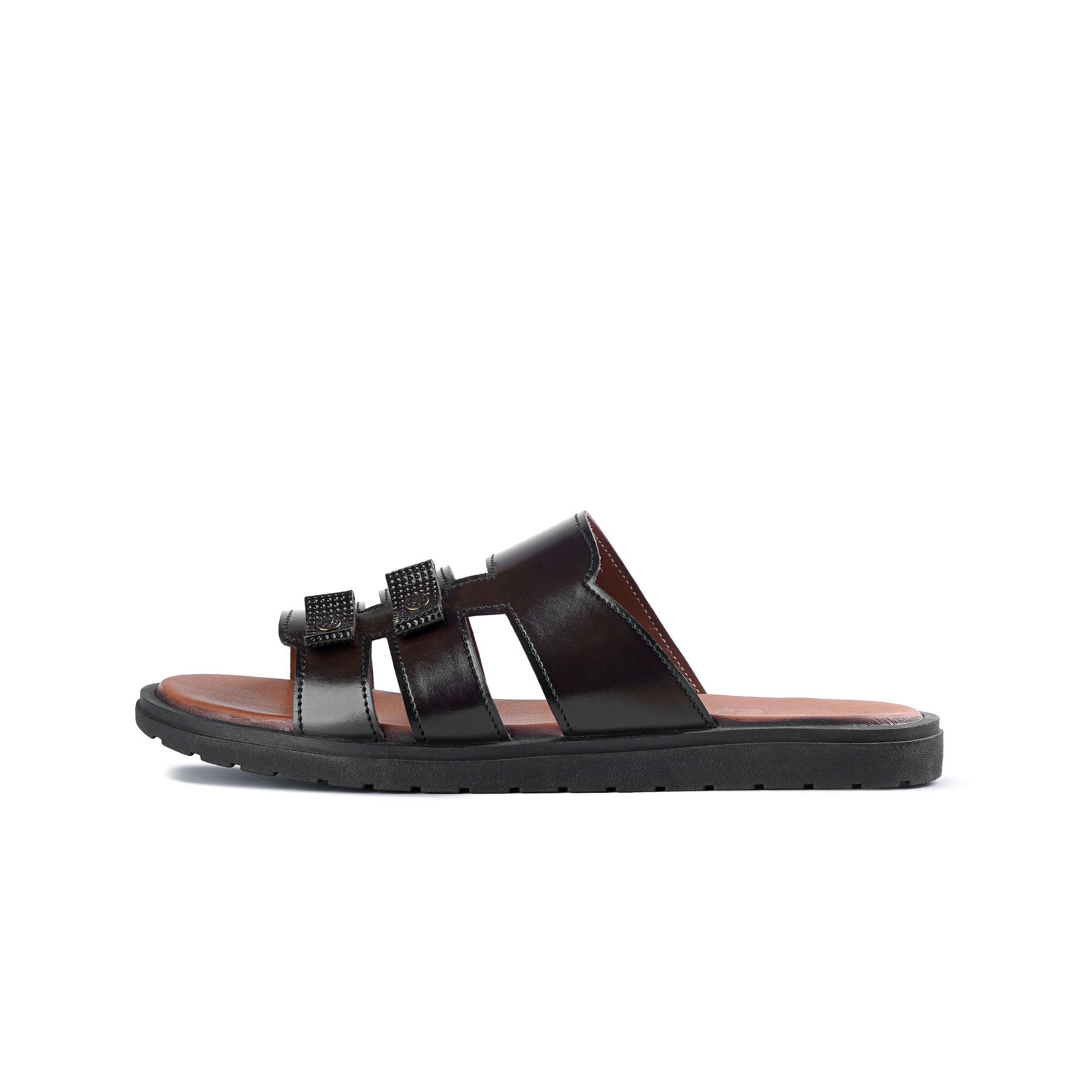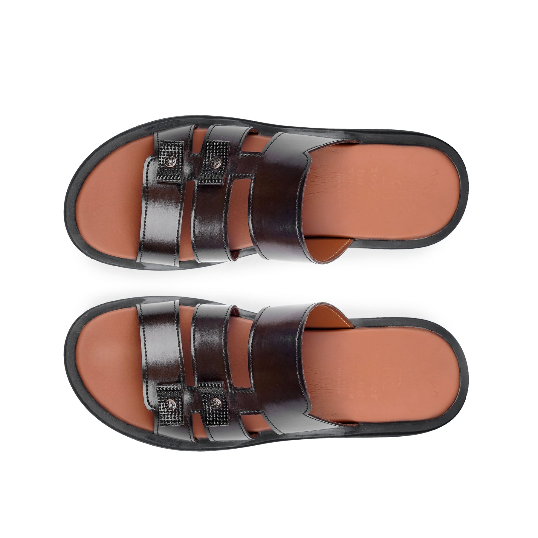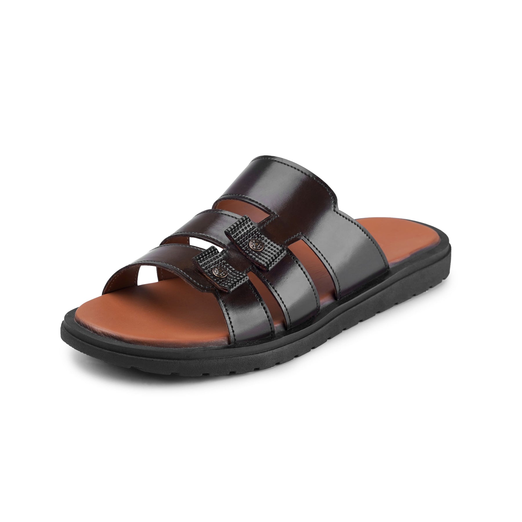 A sleek, easy-to-wear men’s slide sandal featuring a gloss-finish black three‑strap upper with double buckle detailing for a smart, refined look. Finished with a contrast tan footbed and a durable black outsole, making it a great match for shalwar kameez and everyday smart-casual wear.