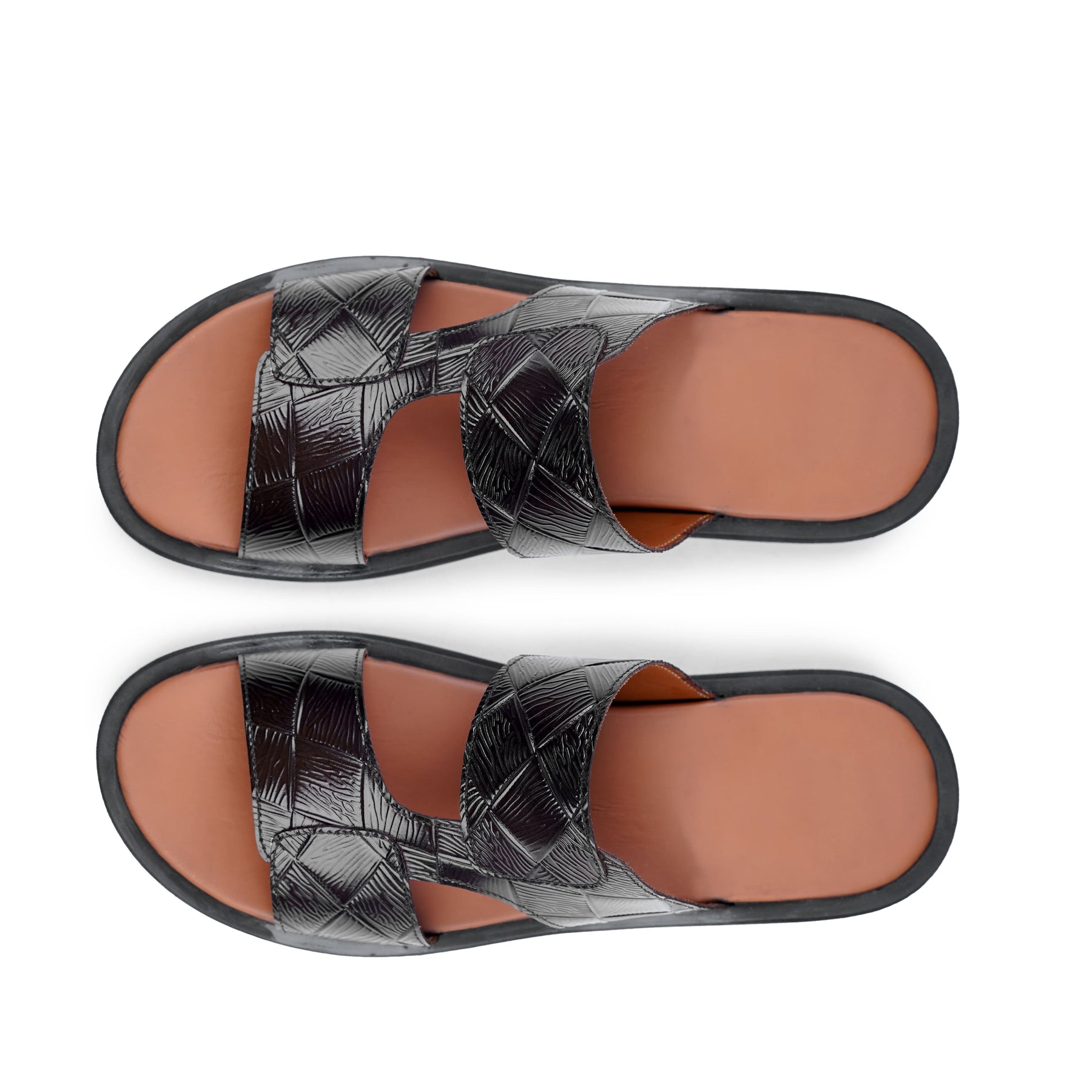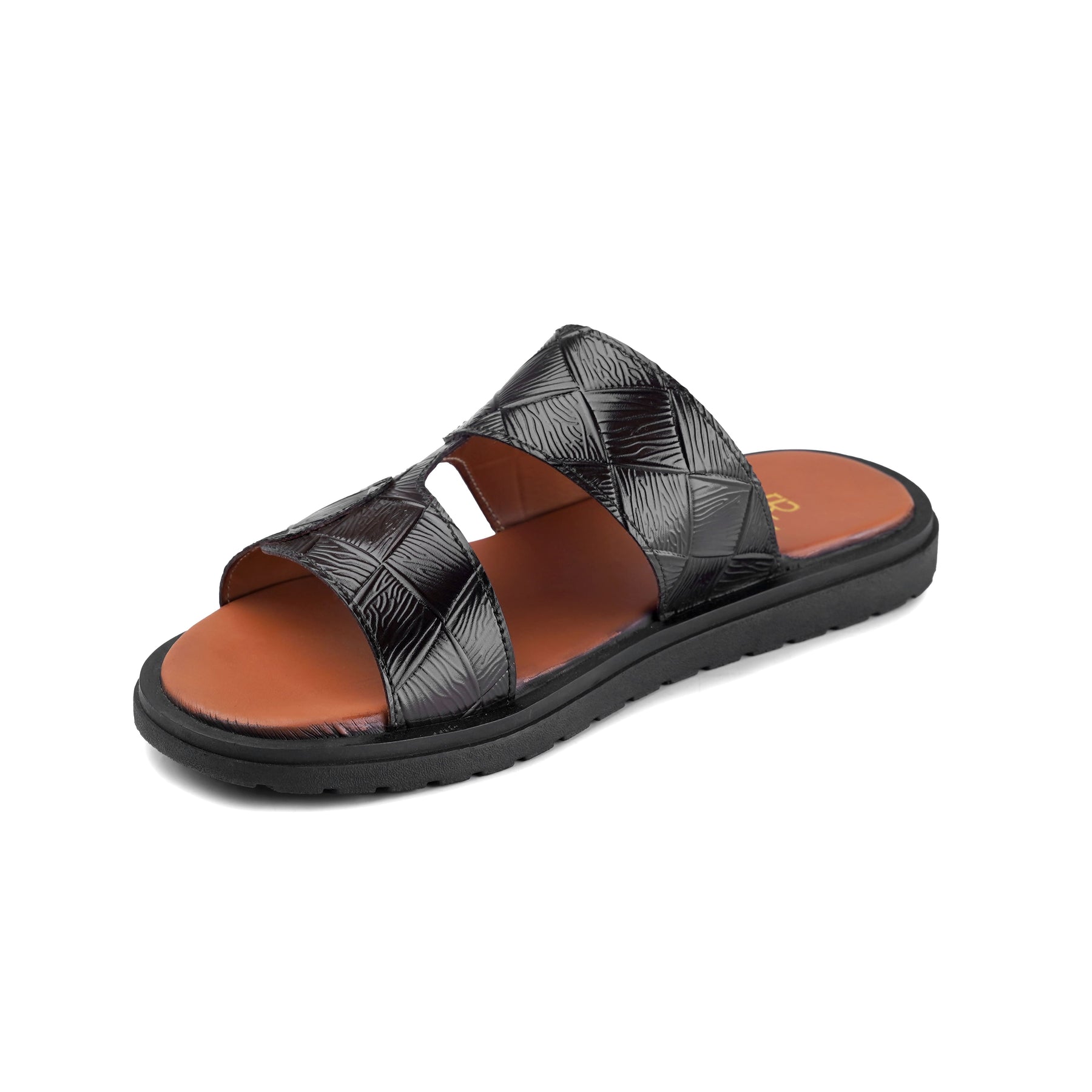 A sleek, modernmen’s slide sandalfeaturing agloss-finish black embossed upperwith a stylishdouble‑strap design. Thecontrast tan footbedadds a premium look, while thesturdy black outsoleoffers everyday comfort and grip. Easy slip-on style that pairs well withshalwar kameezand smart casual wear.