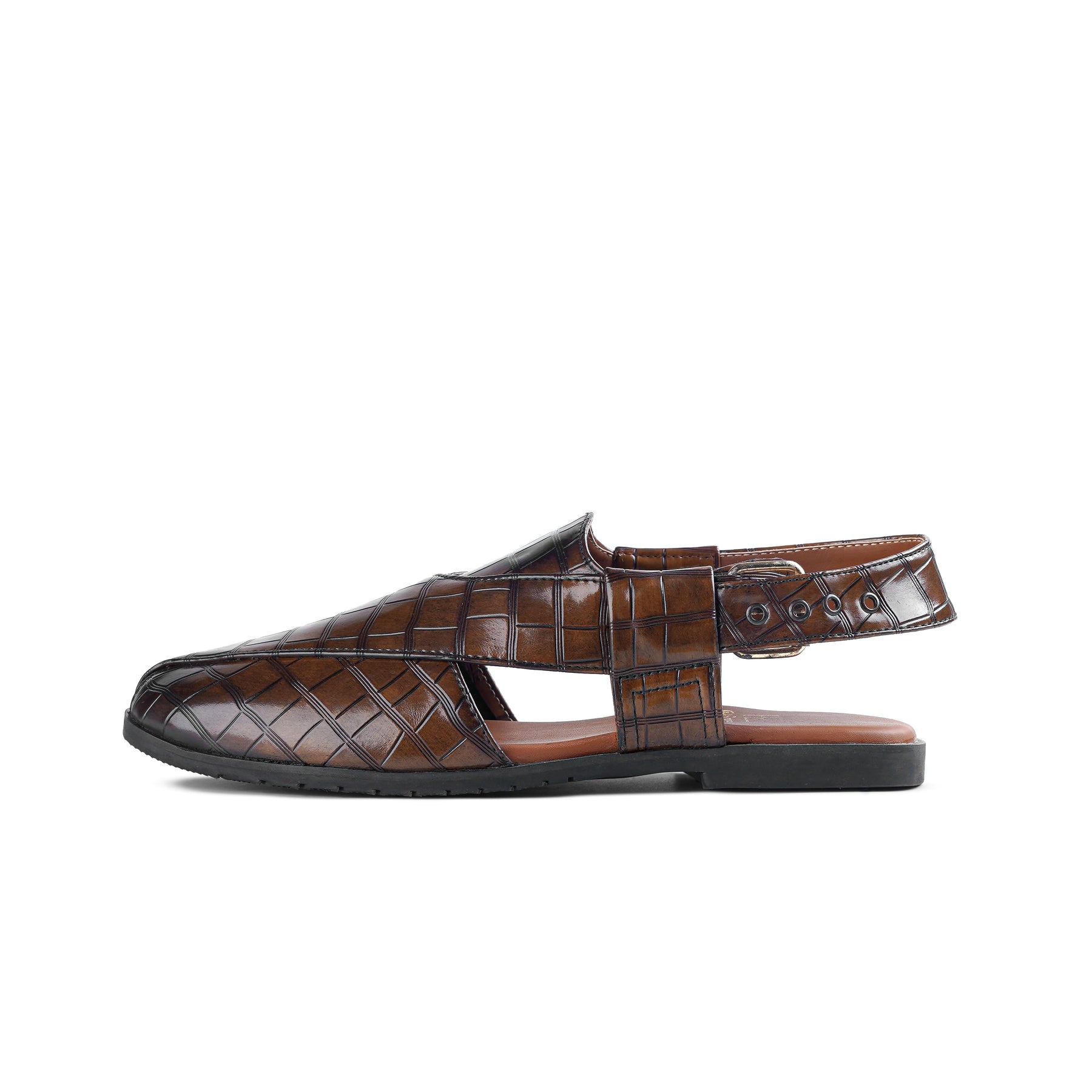 Elevate your traditional look with this premium Peshawari chappal featuring a bold croc‑embossed two‑tone finish and a sleek cross‑strap upper. The semi‑closed toe gives a refined, formal vibe, while the adjustable buckle slingback provides a secure fit—ideal for shalwar kameez and smart casual wear.
