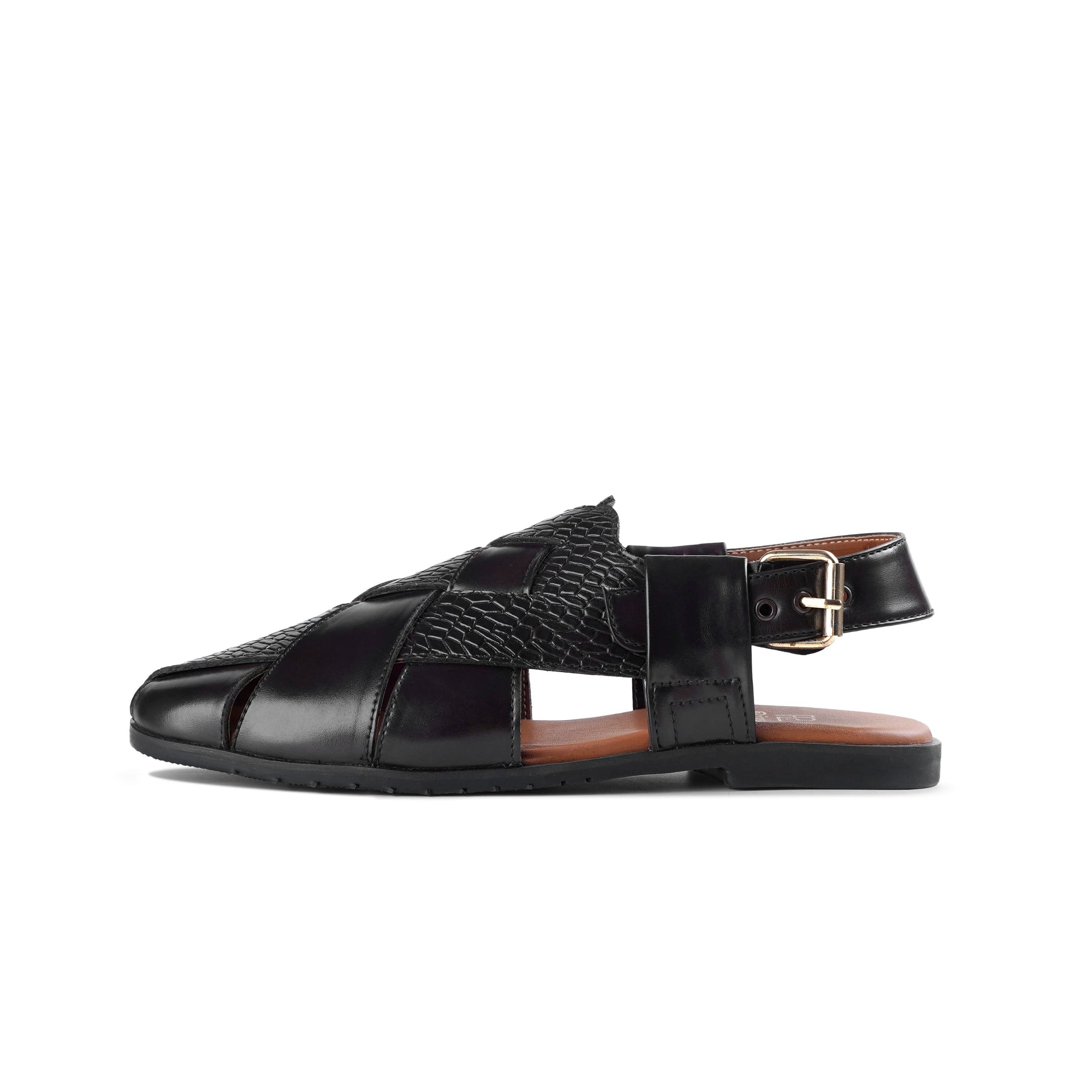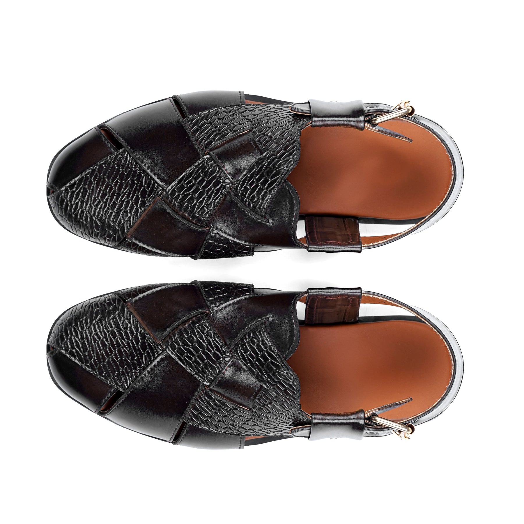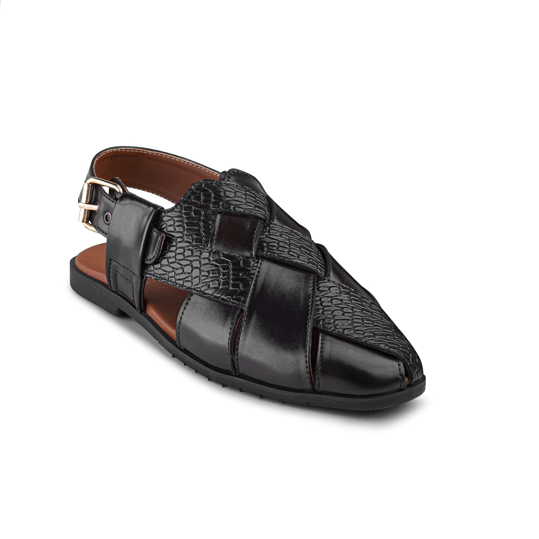 A refined, formal take on the traditional Peshawari chappal. Featuring asemi‑closed toe,cross‑strap woven-style upperwithcroc‑embossed textured panels, and anadjustable buckle slingbackfor a secure fit. Finished with acontrast tan footbedand adurable black outsole, making it a perfect match forshalwar kameezand smart casual wear.