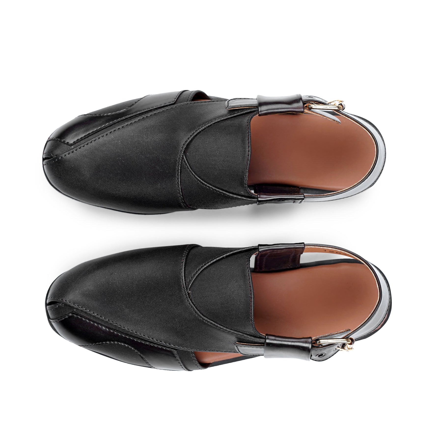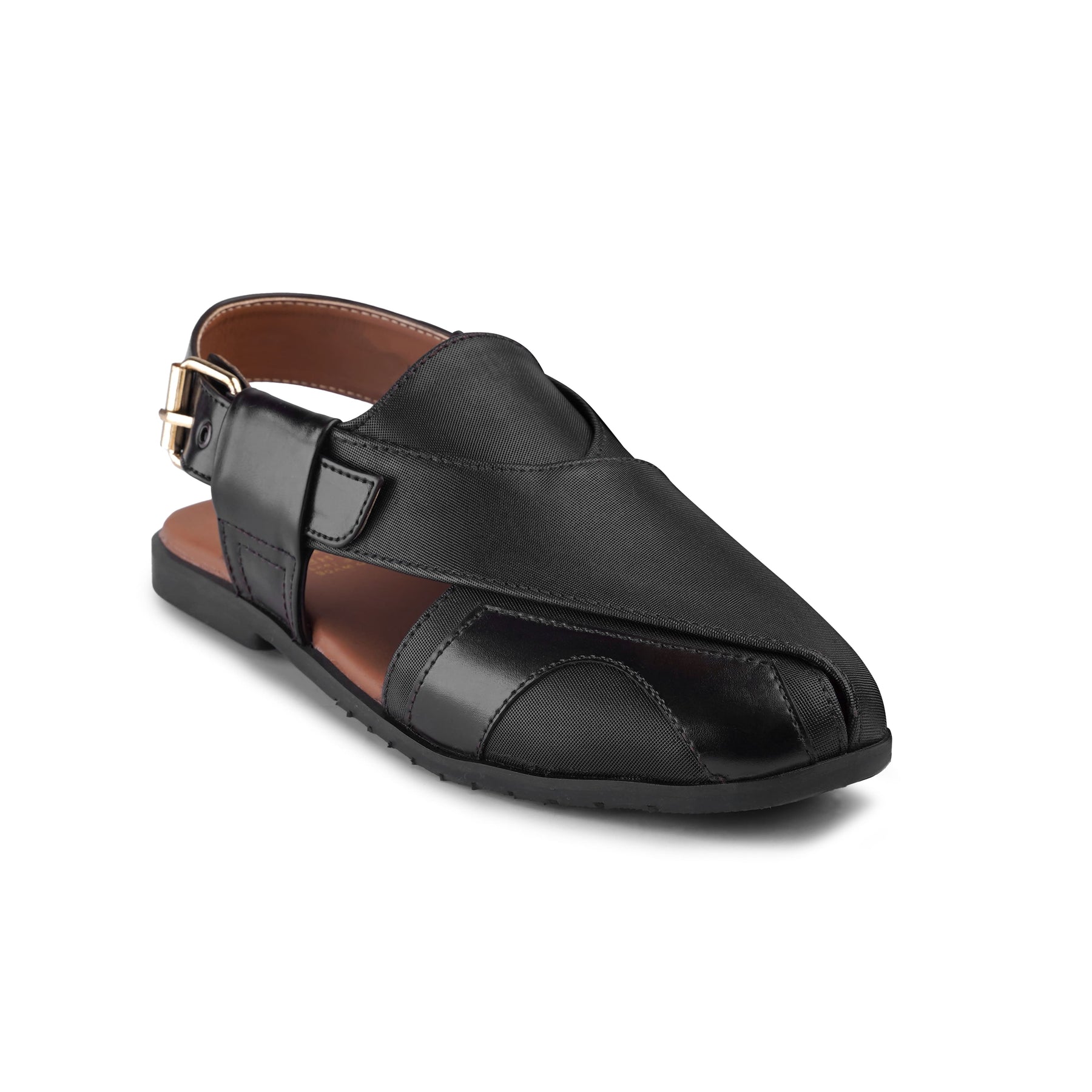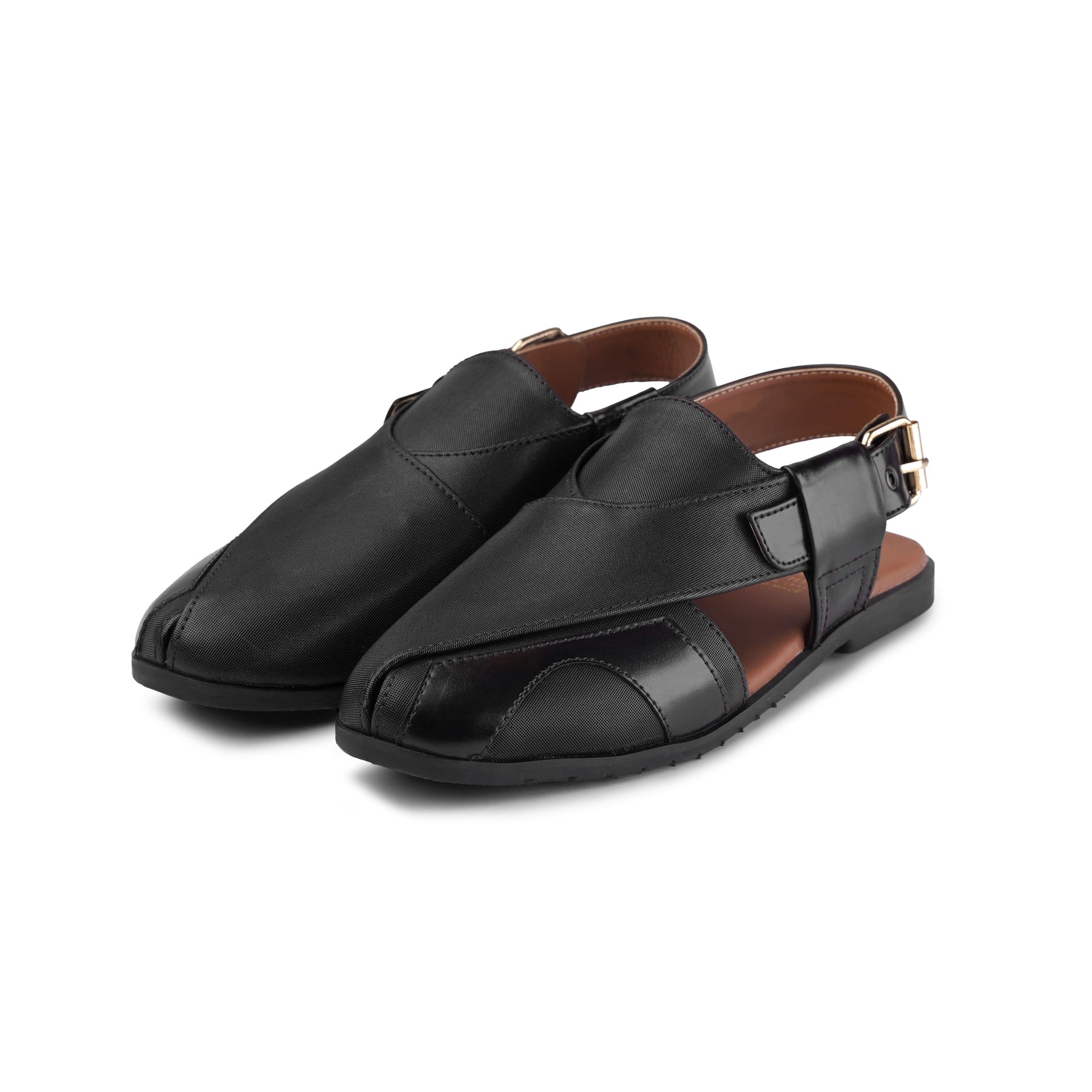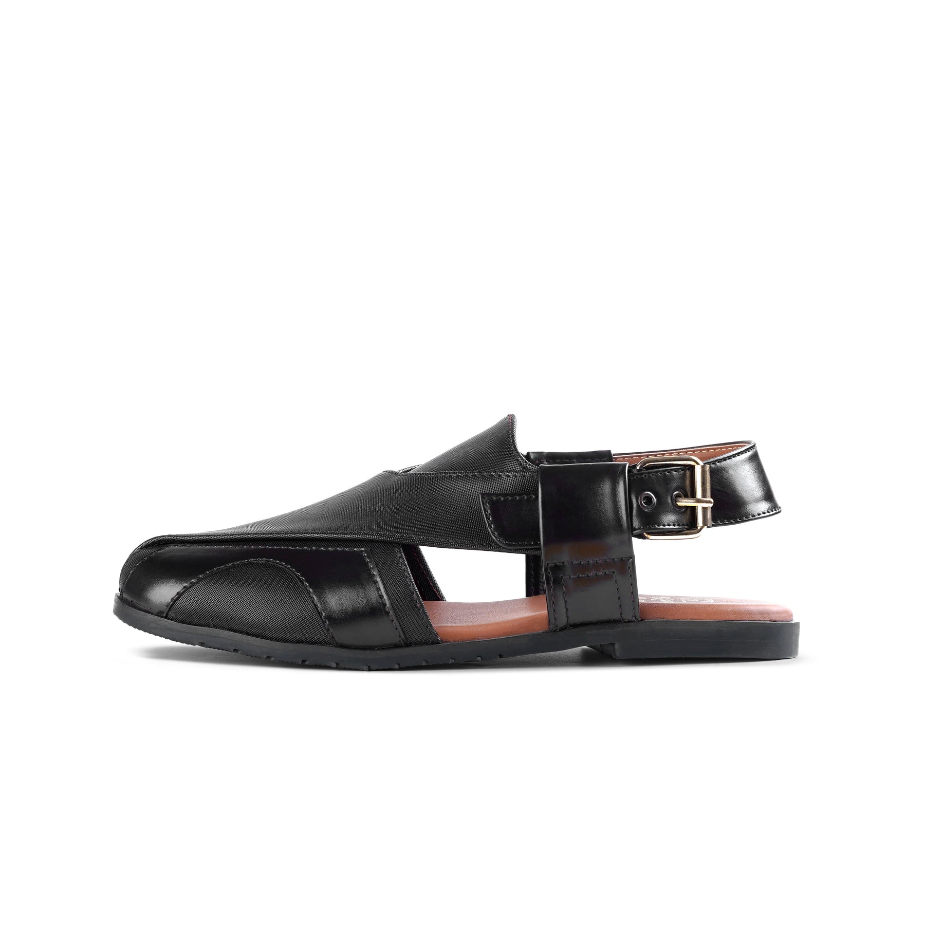 A smart, modern take on the traditional Peshawari chappal. Designed with asemi‑closed toe, atextured cross‑strap upperwithgloss-finish side panels, and anadjustable buckle slingbackfor a secure fit. Finished with acontrast tan footbedand adurable black outsole, making it a perfect match forshalwar kameezand formal/smart casual wear.
