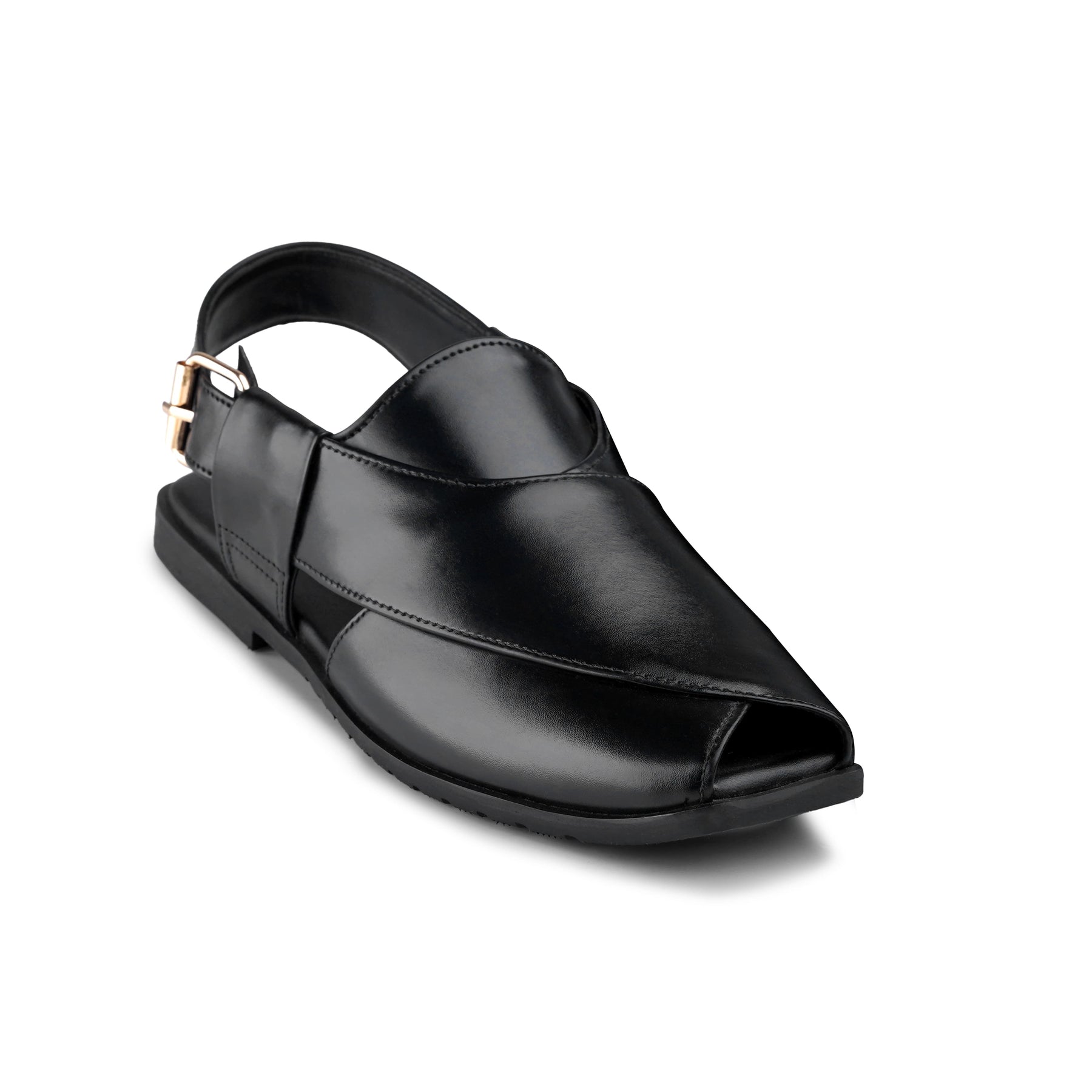 A sleek, modern take on the traditional Peshawari chappal. Featuring agloss-finish smooth upperwith across‑panel design, asemi‑open toefor comfort, and anadjustable buckle slingbackfor a secure fit. Finished with adurable outsoleand a clean formal silhouette—perfect forshalwar kameezand smart casual wear.