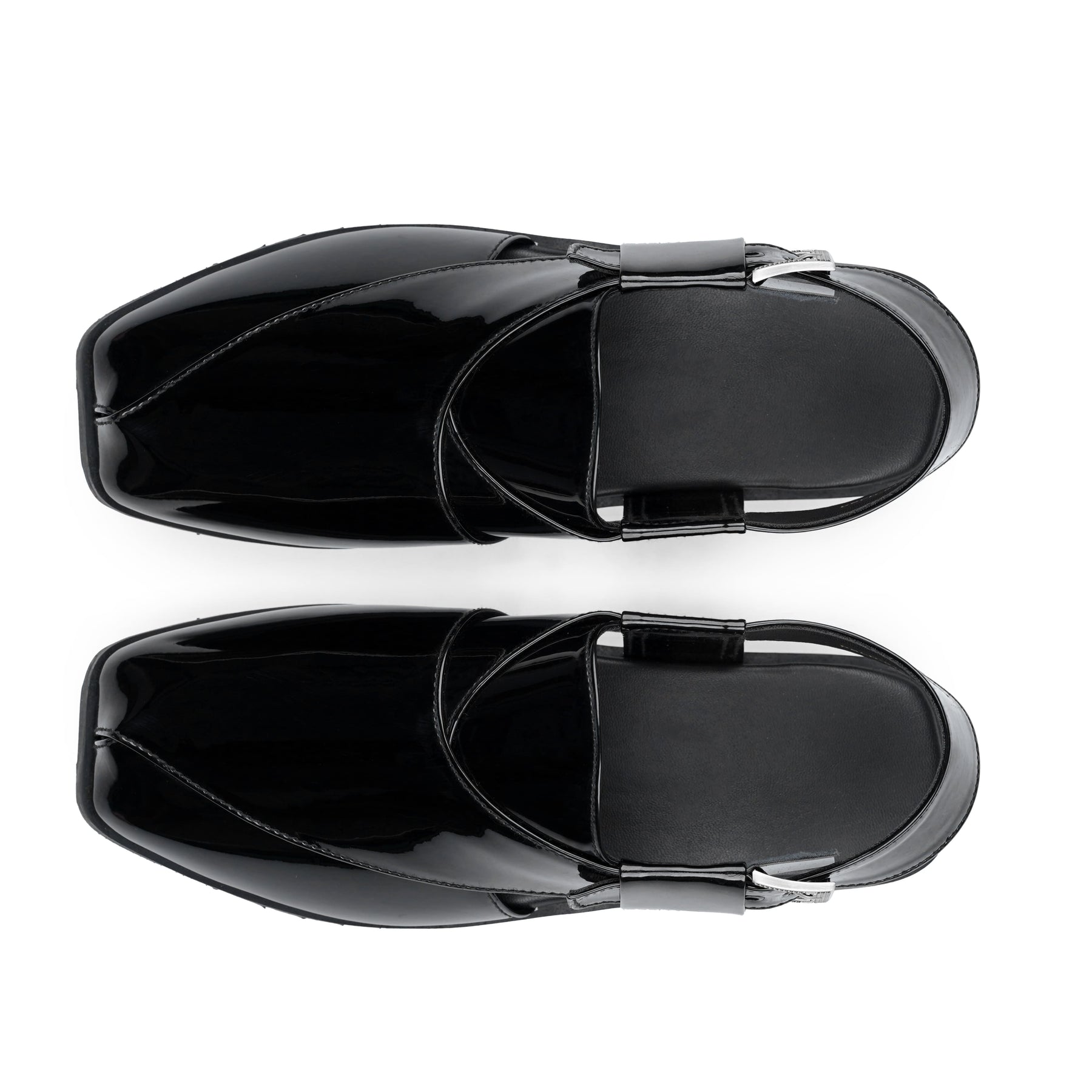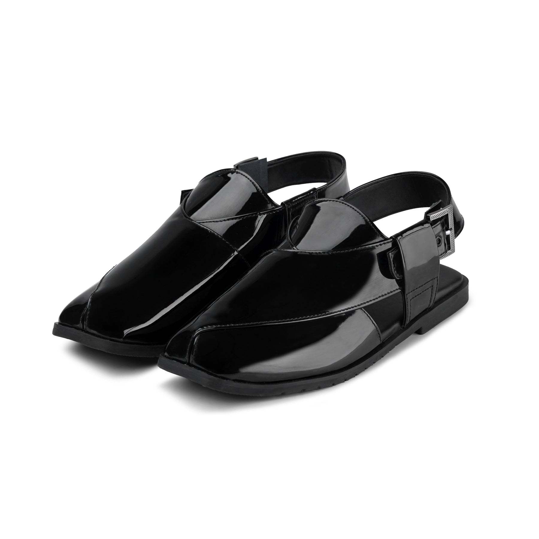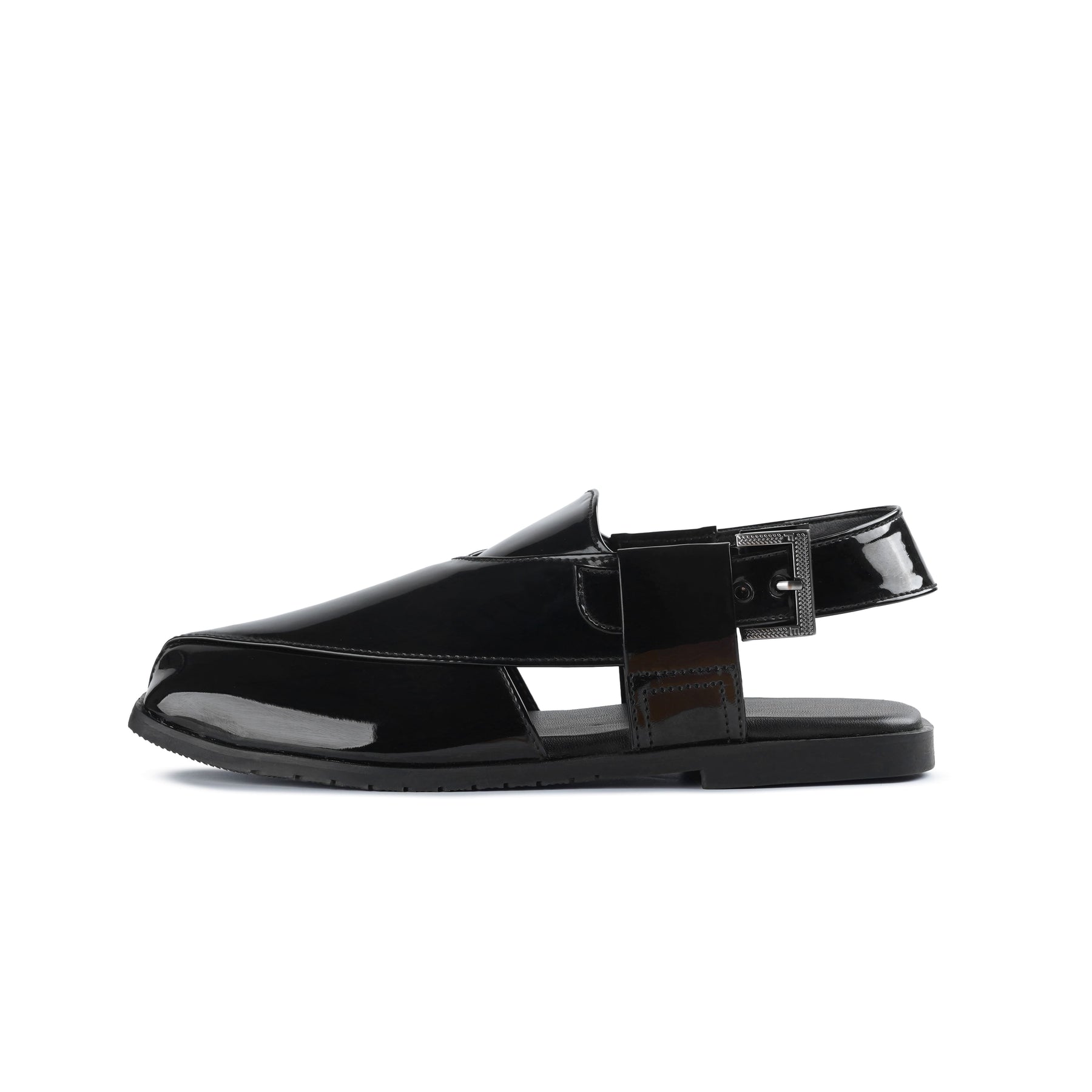 A modern, formal take on the traditional Peshawari chappal. Designed with asemi‑closed toeand sleekcross‑panel upper, finished in ahigh‑gloss blackfor an elegant look. Theadjustable buckle slingbackensures a secure fit, while theside cut‑outsadd comfort and breathability—perfect forshalwar kameezand smart casual wear.